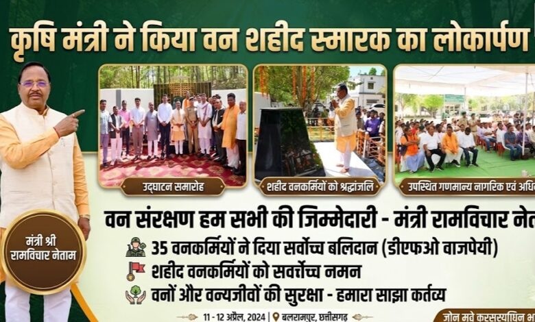 कृषि मंत्री ने किया वन शहीद स्मारक का लोकार्पण शहीद वनकर्मियों को दी श्रद्धांजलि,,वन संरक्षण हम सभी की जिम्मेदारी – मंत्री रामविचार नेताम