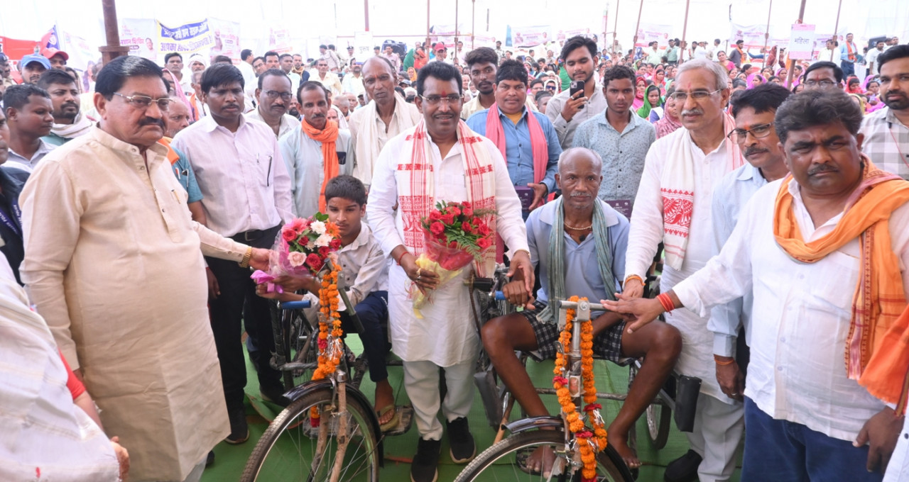 शिविर में प्रभारी मंत्री बघेल एवं विधायक ने 5 गर्भवती महिलाओं को पोषण आहार किट प्रदान कर गोदभराई रस्म एवं 2 शिशुओं का अन्नप्रासन किया। साथ ही उनके उत्तम स्वास्थ्य एवं उज्जवल भविष्य की शुभकामनाएं दी। साथ ही टीबी मुक्त भारत अभियान में उत्कृष्ट कार्य के लिए ग्राम पोंड, कुटेना, फुलझर एवं मुरमुरा के सरपंच, स्वच्छता के क्षेत्र में उत्कृष्ट कार्य करने वाले स्वच्छाग्राहियों एवं मेधावी विद्यार्थियों को सम्मानित किया। इसके अलावा हितग्राहियों को ट्रायसिकल, आइस बॉक्स सौर सुजला किट, मछली जाल जैसे सामग्री एवं राशन कार्ड का वितरण भी किया। इस अवसर पर विधायक श्री साहू ने मुख्यमंत्री श्री विष्णु देव साय के मंशानुरूप राज्य में शुरू किए गए सुशासन तिहार के आयोजन के उद्देश्यों के संबंध में विस्तार से जानकारी दी। उन्होंने सुशासन तिहार के आयोजन के निर्णय को राज्य सरकार के अत्यंत जनहितैषी एवं संवेदनशील निर्णय बताते हुए सराहना की। उन्होंने कहा कि इस सुशासन तिहार के माध्यम से राज्य सरकार के द्वारा शासकीय काम-काज में पारदर्शिता लाने तथा शासकीय योजनाओं और कार्यक्रमों का प्रभावी क्रियान्वयन सुनिश्चित करने का कारगर प्रयास किया जा रहा है। साथ ही प्रदेश में मोदी जी की गारंटी को तत्परता से पूर्ण किया जा रहा है।