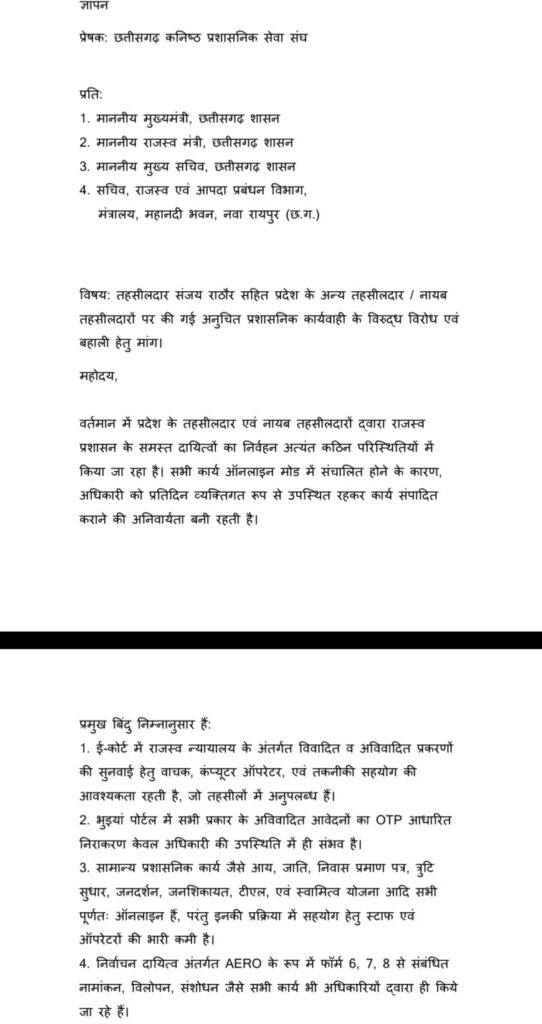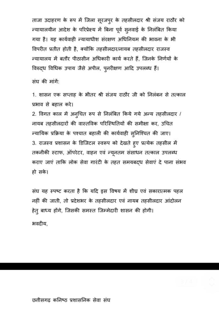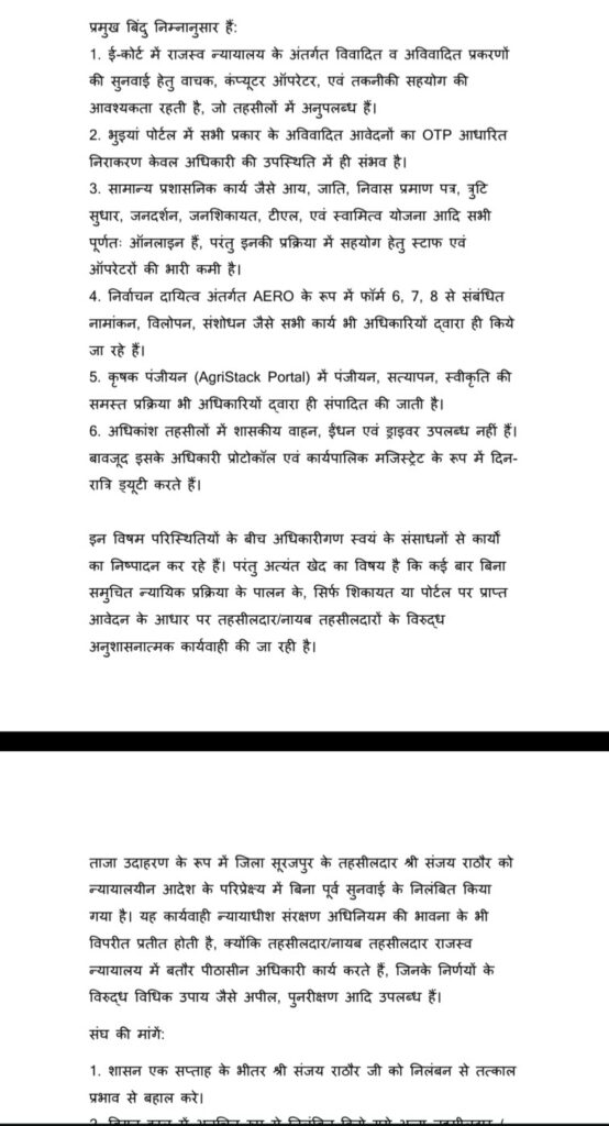1. तत्काल बहाली: भैयाथान तहसीलदार संजय राठौर को तत्काल प्रभाव से बहाल किया जाए।