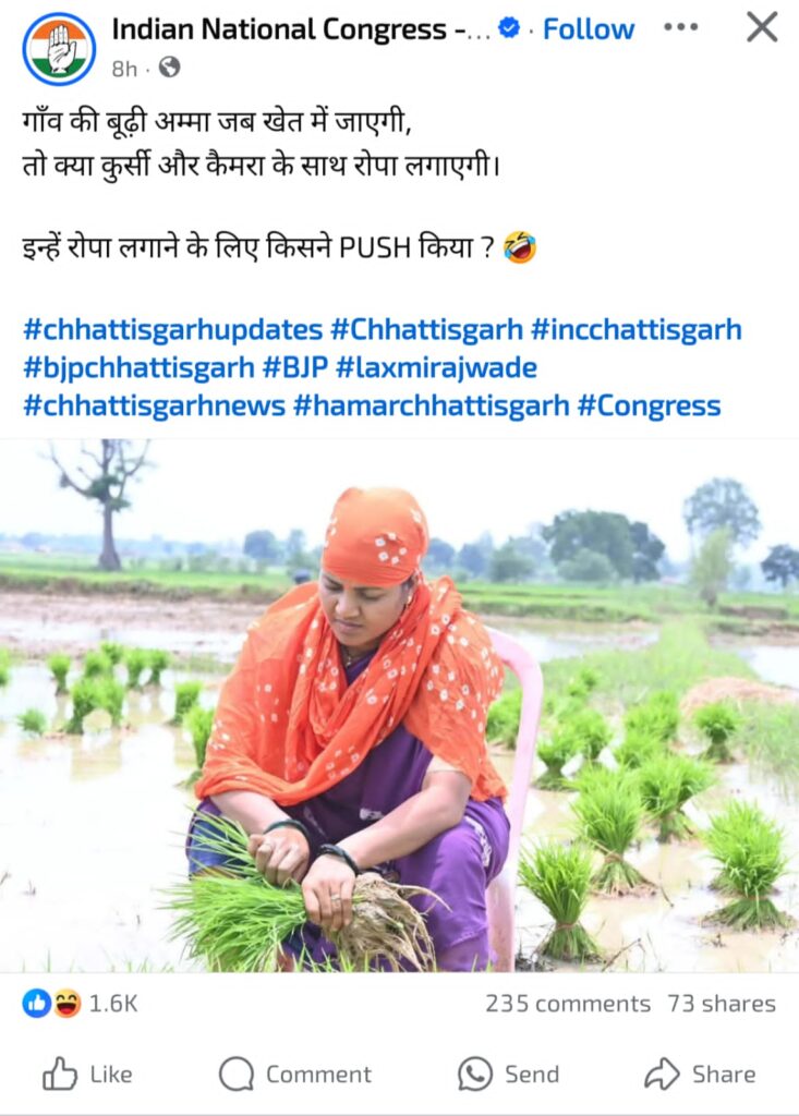 महिला बाल विकास विभाग की मंत्री का धान के खेत में कुर्सी पर बैठकर रोपा लगाना और इस समय की तस्वीर खिंचवाकर उसे सोशल मिडिया पर साझा करना प्रमुख विपक्षी दल कांग्रेस के लिए भी एक मुद्दा बन गया है जिसे लेकर कांग्रेस के अधिकारिक सोशल मिडिया हैंडल से एक पोस्ट जारी हुआ है जिसमें लिखा है कि क्या गांव की बूढ़ी अम्मा रोपा लगाने जाएगी तो कुर्सी और कैमरा साथ लेकर जाएगी,इन्हें किसने रोपाई के लिए पुश किया यह कांग्रेस ने सवाल उठाए हैं। कांग्रेस के तंज के पीछे की वजह मंत्री जी की सोशल मिडिया तस्वीर है जिसमें वह एक तरफ धान रोपाई कर रही हैं वह भी कुर्सी पर बैठकर और दूसरी तरफ कोई कैमरा लिए उनकी तस्वीर खींच रहा है और उसे उनकी सोशल मिडिया आईडी पर साझा किया जा रहा है।