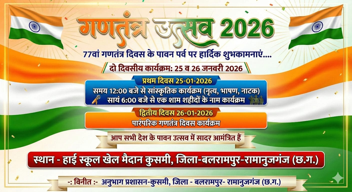 📍 कुसमी /बलरामपुर दुर्गेश गुप्ता इस वर्ष देश का 77वां गणतंत्र दिवस नगर कुसमी में दो दिवसीय भव्य समारोह के…