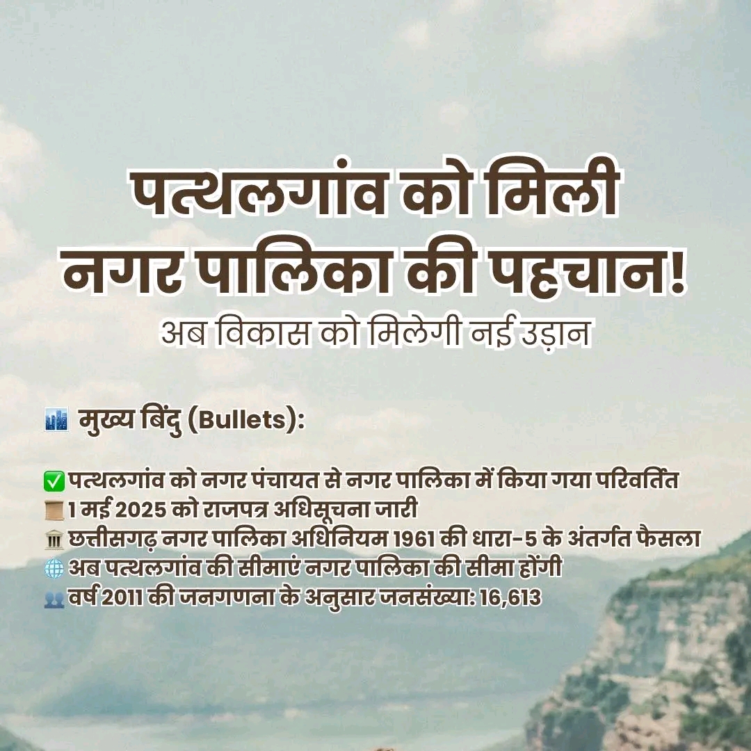 जिले के पत्थलगांव वासियों के लिए एक अच्छी खबर निकलकर सामने आई है। पत्थलगांव नगर पंचायत को अब नगर पालिका…
